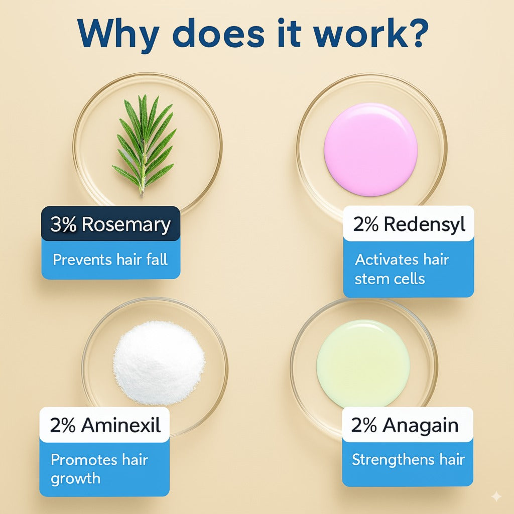Question 1: How quickly can I expect to see results with this serum?Answer 1: Visible transformation begins within just 4–6 weeks of consistent use. Our premium formula is crafted to help you reclaim fuller, denser hair—sooner than you’d expect.Question 2: Is this product suitable for both men and women?Answer 2: Absolutely. This unisex serum is thoughtfully formulated for all hair types, offering an elegant solution for anyone seeking thicker, healthier hair—regardless of gender.Question 3: Are the ingredients in this serum clinically proven to work?Answer 3: Yes—our formulation features prestigious, clinically-backed actives such as Rosemary, Redensyl®, and Anagain™. Each ingredient is selected for its proven performance in stimulating hair growth and revitalizing the scalp.